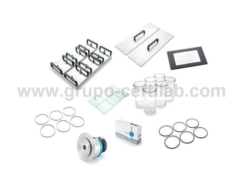 Conteúdo do Kit: 6 cooling plates, 6 glass beakers, 6 metal rings, 6 elastomer sealing rings, 6 support rings, 6 square glass plates, frame for glass plates, sample cutter, set of covers, refractometer.