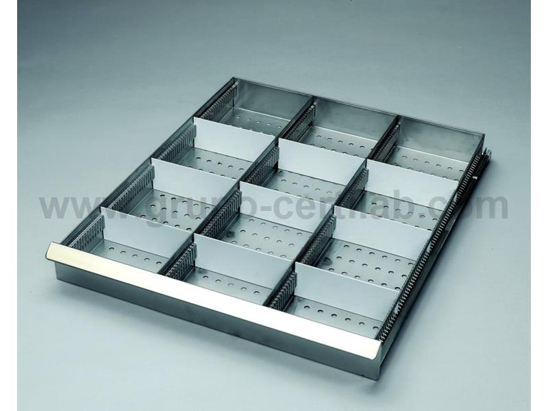 Gaveta de extracção total em aço plastificado a branco, com 2 separadores longitudinais fixos e 6 diagonais ajustáveis